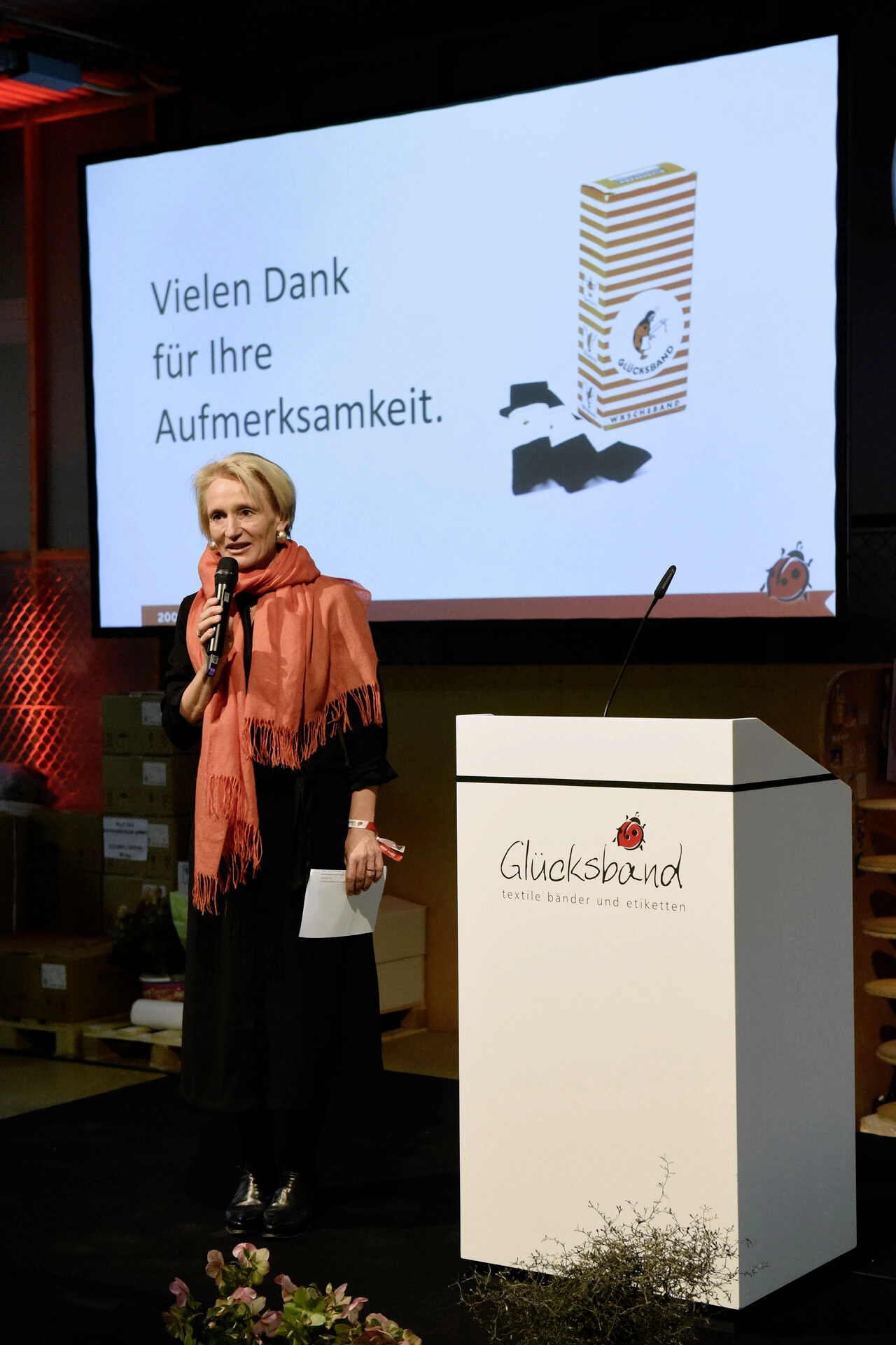 Den Abschluss der Redner bildete Silvia Jungbauer, Hauptgeschäftsführerin der GESAMTMASCHE e. V. „In Italien habe ich bei einem Lampenhersteller gelernt, dass es darum geht, Licht zu verkaufen und nicht Lampen“, so Silvia Jungbauer. Genau das mache Glücksband, indem sie Lösungen böten, über die Produkte hinaus.